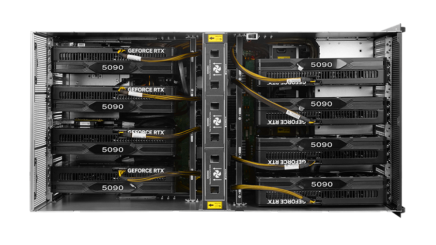 GPU卡 直通8卡服务器风扇版:支持 8 张 600W 3 宽、3.3 宽、3.5 宽、4.5 宽 RTX 5090 风扇卡或其他600W 风扇卡 GPU, GPU 采用前后4+4 分离上下分风道布局